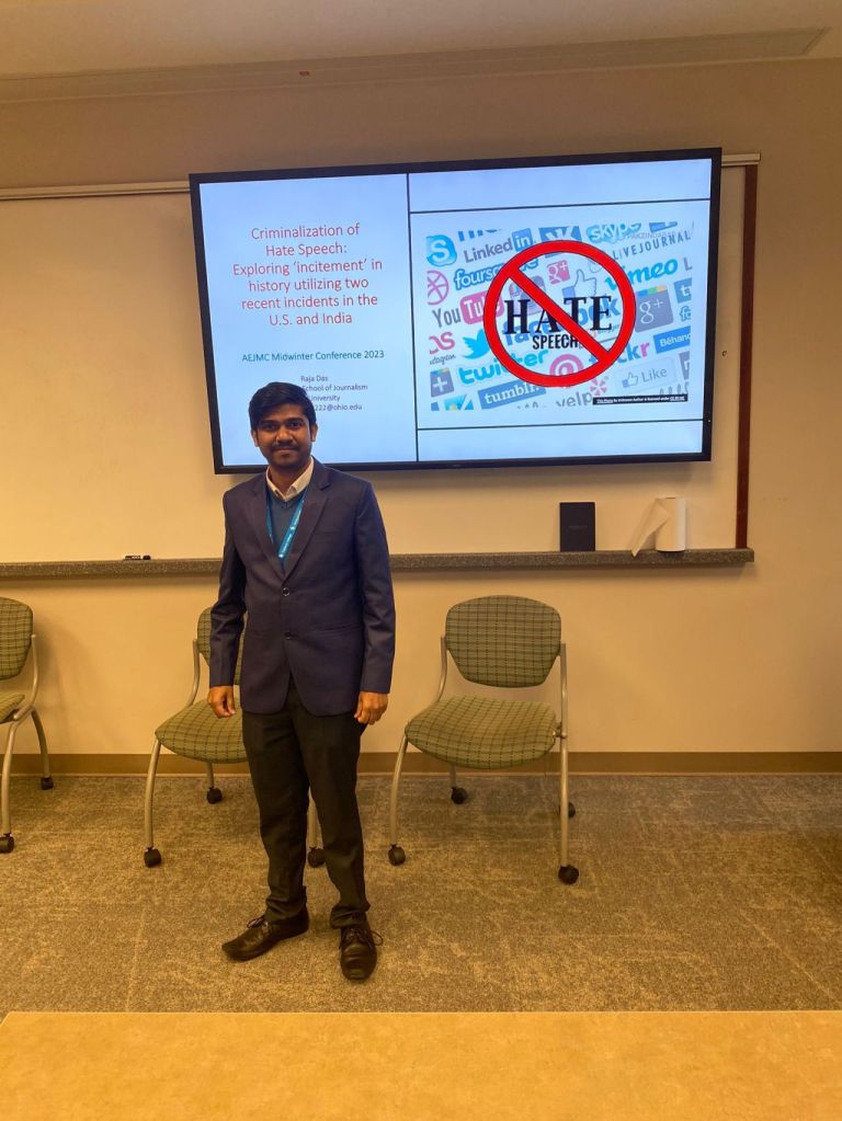 My research area is media, law, and politics. More particularly, I take interest in looking at the political speeches, especially the legal aspects of Hate Speech and its contest with the Free Speech rights initially in the United States and India. At present, I am working on a proposal to study how US and Indian media represents the legal aspects of hate speech incidents and how journalists play the role in shaping legal consciousness of the public while covering hate speech incidents. In this broader context, I have already presented two conference paper in the AEJMC 2023 so far which are titled as “Criminalization of Hate Speech: Exploring “incitement” in history utilizing two recent incidents in the US and India” and “A qualitative analysis of Hindutva Hate Speech using Diffusion of Innovation Theory”.